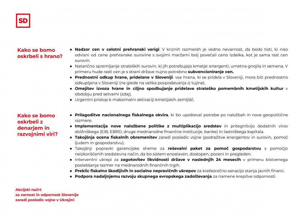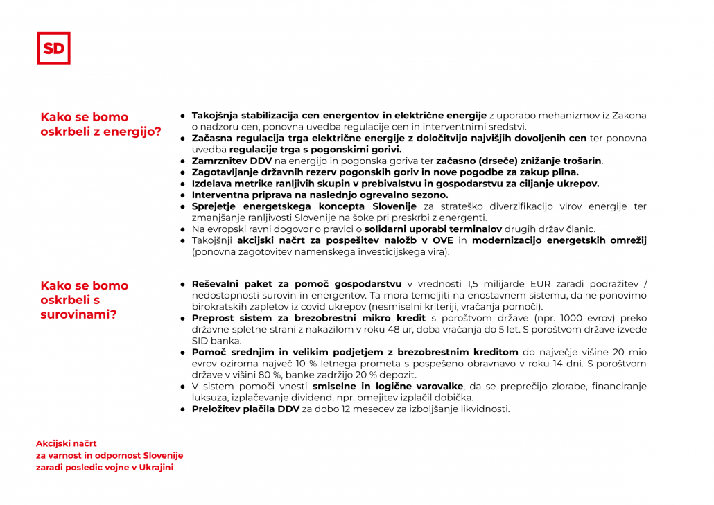 Med ukrepi je izpostavila predvsem tiste, ki rešujejo najbolj akutne težave ljudi in gospodarstva, ob tem pa poudarila, da je akcijski načrt Socialnih demokratov širši in naslavlja več področji: »Zagovarjamo regulacijo trga z električno energijo z določeno najvišjo dovoljeno ceno. Zaradi hude rasti cen surovin in dobrin zagovarjamo tudi prednostni odkup vse hrane, ki je pridelana v Sloveniji ter nadzor cen v celotni prehrambeni verigi. Predlagamo reševalni paket v vrednosti poldruge milijarde evrov z brez obrestnimi krediti za gospodarstvo.«